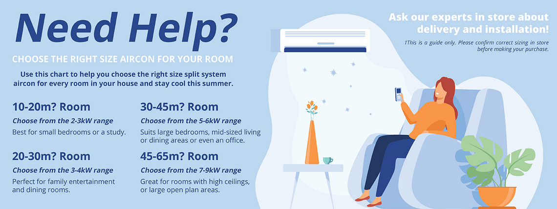 Measure up your space with a tape measure to determine its dimensions then call one of our local stores who can advise you on the best-split system air conditioner to suit your needs. Consider a portable air conditioner if you need a flexible and convenient cooling solution for smaller spaces. Ask about installation and delivery.
